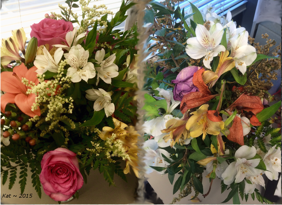 A moment of silence then for my sad vase of cut flowers. For a life too short, but a valuable lesson gained. For teaching me that my vain attempts to be who I am not, merely causes me to live a life less than. Dear cut flowers…even your faded, falling blooms have touched my heart and changed me. Namaste’.