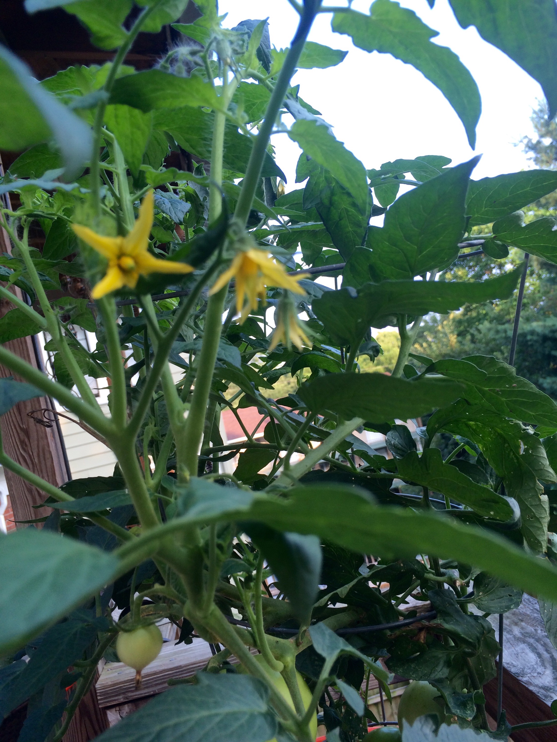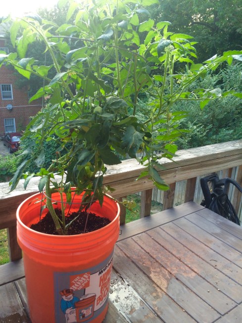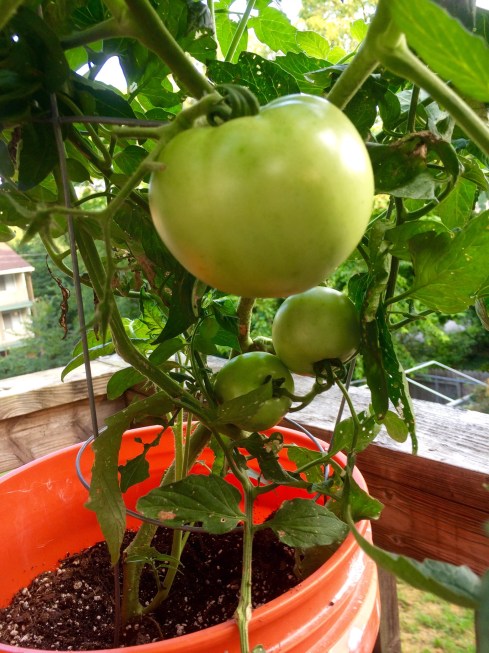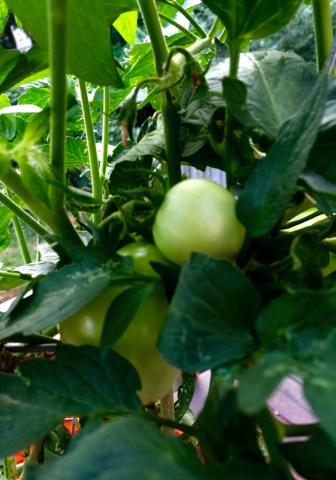 Tonight…tonight some 39 years ago, I became a mother to a dark, curly haired sprite who would change my life forever. Tonight…this night, as the moon glows just a breath from fullness, I experienced the thrill of another kind of “mothering”. That silly volunteer tomato plant, that calls my back porch home, is laboring with her first fruits. This will be another truly life changing moment for this reluctant gardener!