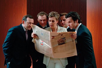 Business people reading paper CREDIT © Image Source RF / Ben Kepler