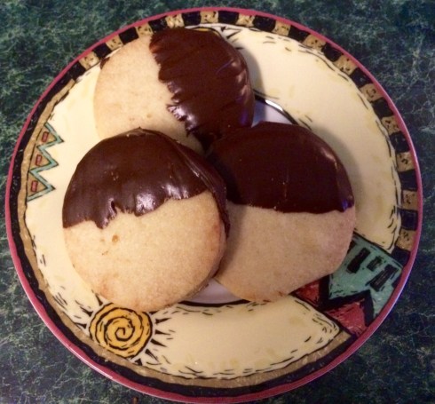 While your cookies are cooling melt semI-sweet chocolate chips according to the package instructions. I like to use a cup or a short drinking glass in the microwave to make dipping easier. Take care not to burn the chocolate (a lesson learned from personal experience!).Dip your cookies halfway and place on waxed paper to cool. I had thought about doing a nice plated view for you, but I was afraid they might not last that long…so here they are! Enjoy!!!