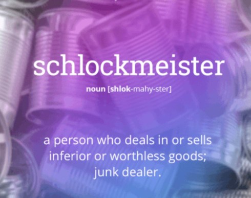 Schlockmeister is called an Americanism, originating around 1960-65. It’s a combination of schlock, a Yiddish word meaning cheap or trashy and mayster or German Meister which means master craftsman.
