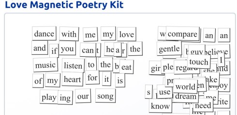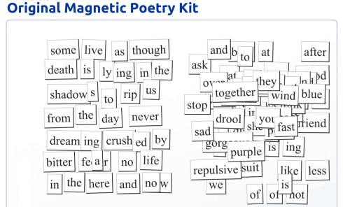 A collection of poems using the Nature, Poet, Love, and Original kits found at Magnetic Poetry Online.