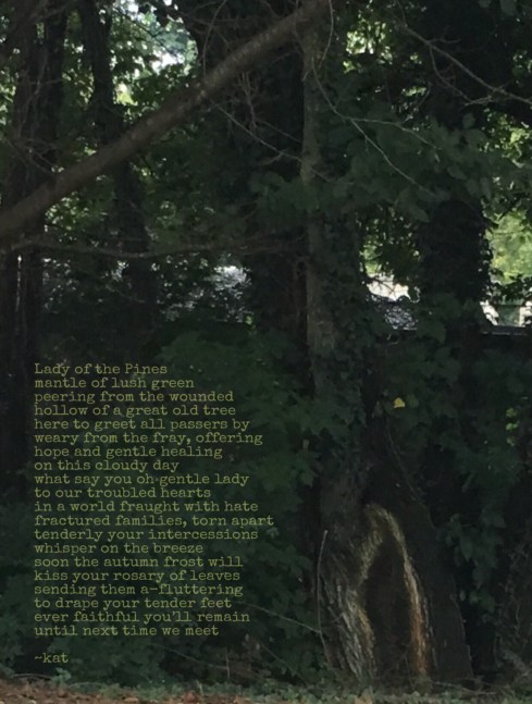 For a dear friend who suggested there was a poem in this photo. This old tree sits a block over next to a small stream along the fence line of the coal rail yard. When I’m feeling stressed or sad or frustrated I walk my little dog by this tree. I don’t deserve such an amazing gift. The Lady of the Pine, as I like to call her, must know I need her.