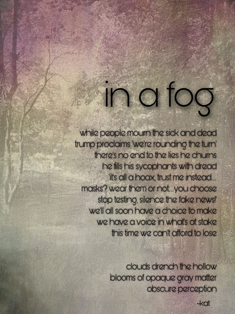 while people mourn the sick and dead trump proclaims ‘we’re rounding the turn’ there’s no end to the lies he churns he fills his sycophants with dread ‘it’s all a hoax, trust me instead… masks? wear them or not…you choose stop testing, silence the fake news!’ we’ll all soon have a choice to make we have a voice in what’s at stake this time we can’t afford to lose