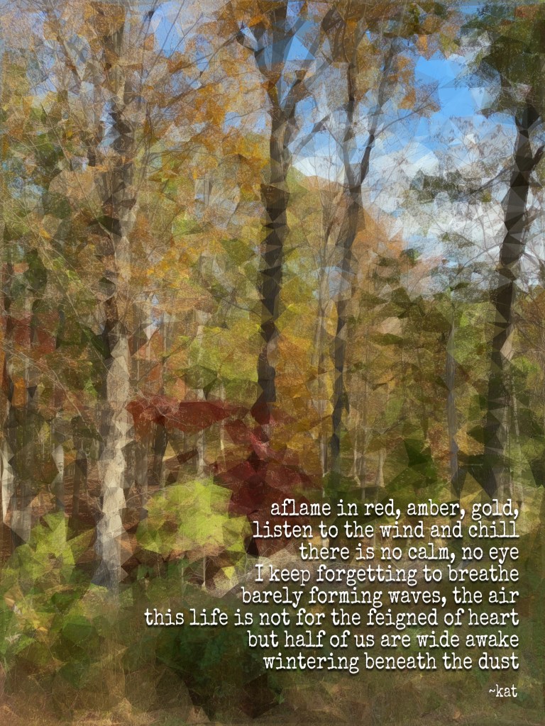 A dozen of more leaves drift from the treetops, settling softly on the damp ground as I imagine myself turning, turning. No amount of angst will change what is. Time to let go. Time to ride the wind instead of leaning into it full-faced, stubborn, unmoved. I wish you peace and health and love.