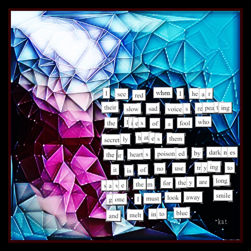 I see red when I hear their slow sad voices repeating the lies of a fool who secretly hates them; their hearts poisoned by darkness. It is of no use trying to save them for they are long gone…I must look away, smile, and melt into blue.