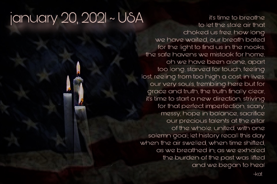 it’s time to breathe to let the stale air that choked us free, how long we have waited, our breath bated for the light to find us in the nooks, the safe havens we mistook for home, oh we have been alone, apart too long, starved for touch, feeling lost, reeling from too high a cost, in lives, our very souls, trembling here but for grace and truth, the truth finally clear, it’s time to start a new direction, striving for that perfect imperfection, scary, messy, hope in balance, sacrifice our precious talents at the altar of the whole, united, with one solemn goal; let history recall this day when the air swelled, when time shifted, as we breathed in; as we exhaled the burden of the past was lifted and we began to heal