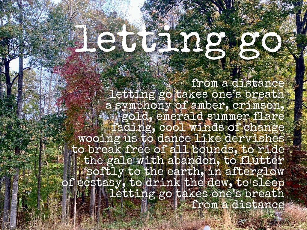from a distance letting go takes one’s breath a symphony of amber, crimson, gold, emerald summer flare fading, cool winds of change wooing us to dance like dervishes to break free of all bounds, to ride the gale with abandon, to flutter softly to the earth, in afterglow of ecstasy, to drink the dew, to sleep letting go takes one’s breath from a distance