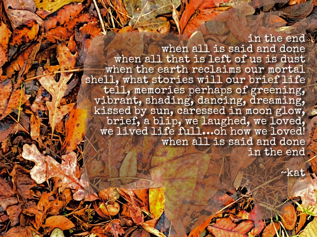 in the end when all is said and done when all that is left of us is dust when the earth reclaims our mortal shell, what stories will our brief life tell, memories perhaps of greening, vibrant, shading, dancing, dreaming, kissed by sun, caressed in moon glow, brief, a blip, we laughed, we loved, we lived life full…oh how we loved! when all is said and done in the end