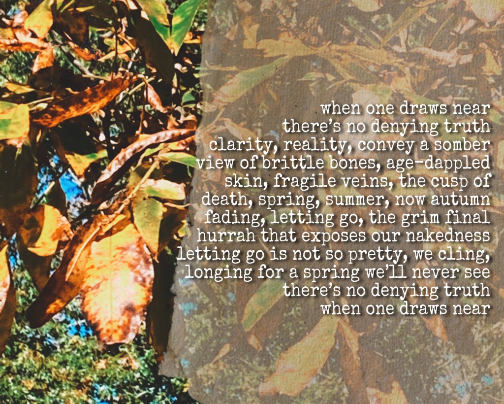 when one draws near there’s no denying truth clarity, reality, convey a somber view of brittle bones, age-dappled skin, fragile veins, the cusp of death, spring, summer, now autumn fading, letting go, the grim final hurrah that exposes our nakedness letting go is not so pretty, we cling, longing for a spring we’ll never see there’s no denying truth when one draws near