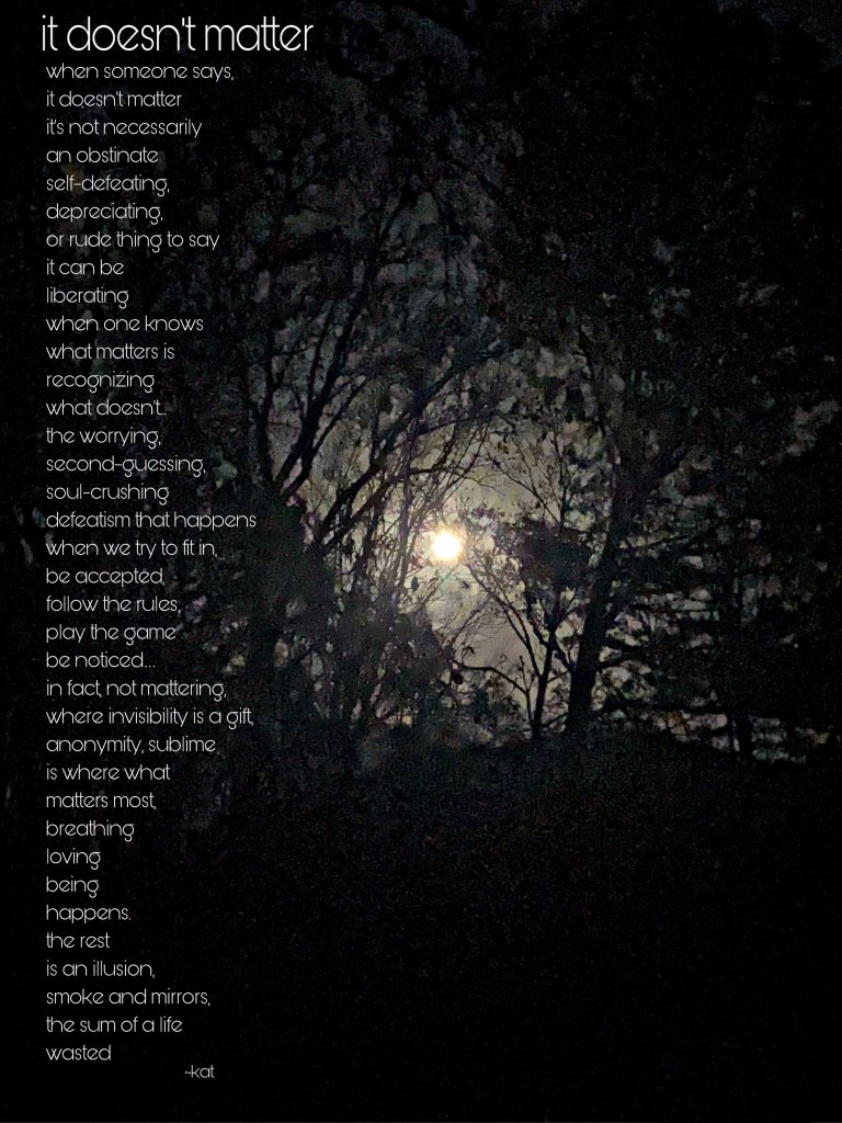 I’m actually in a good place…where nothing matters but the things that do. With age comes wisdom and a general “I don’t give a fuck” attitude! When life gets shorter, you realize life is too short! It is glorious place to be!!! Oh my… did I just say/write fuck?!!! Well I don’t give a “you know what”! 🤪