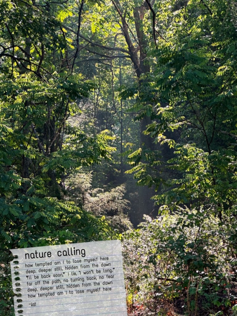 how tempted am I to lose myself here deep, deeper still, hidden from the dawn “I’ll be back soon,” I lie, “I won’t be long.” far off the path, no turning back, no fear deep, deeper still, hidden from the dawn how tempted am I to lose myself here