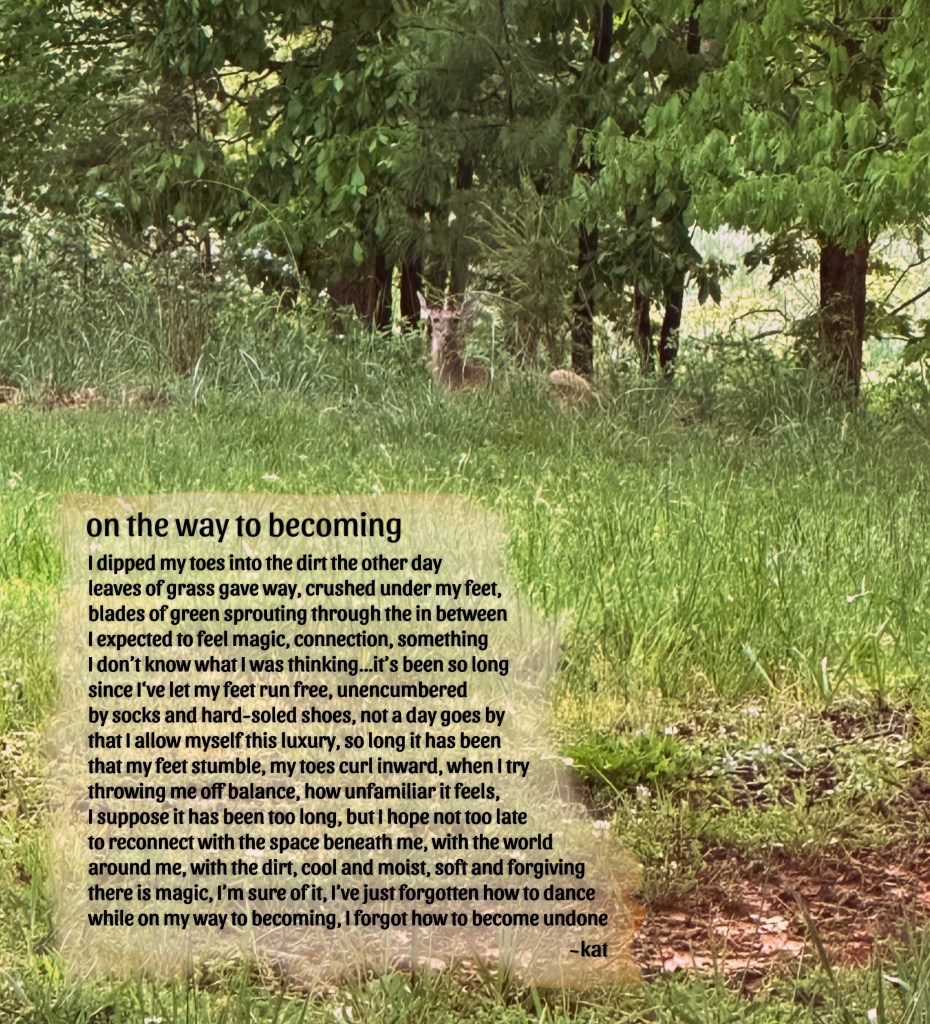 I dipped my toes into the dirt the other day leaves of grass gave way, crushed under my feet, blades of green sprouting through the in between I expected to feel magic, connection, something I don’t know what I was thinking…it’s been so long since I‘ve let my feet run free, unencumbered by socks and hard-soled shoes, not a day goes by that I allow myself this luxury, so long it has been that my feet stumble, my toes curl inward, when I try throwing me off balance, how unfamiliar it feels, I suppose it has been too long, but I hope not too late to reconnect with the space beneath me, with the world around me, with the dirt, cool and moist, soft and forgiving there is magic, I’m sure of it, I’ve just forgotten how to dance while on my way to becoming, I forgot how to become undone