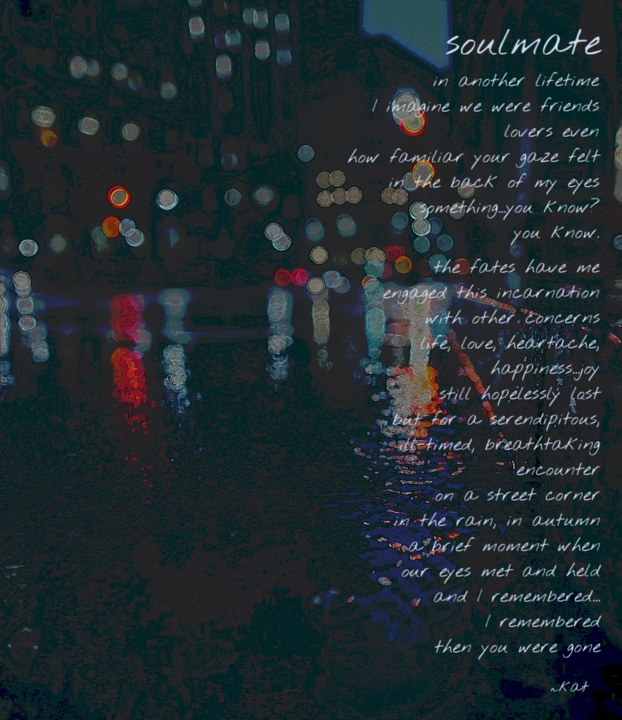 the fates have me engaged this incarnation with other concerns life, love, heartache, happiness…joy still hopelessly lost but for a serendipitous, ill-timed, breathtaking encounter on a street corner in the rain, in autumn a brief moment when our eyes met and held and I remembered… I remembered then you were gone