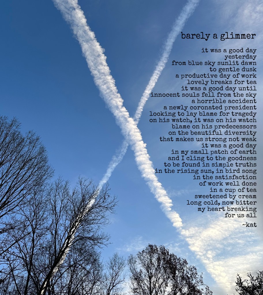 This is yesterday’s poetic offering. Sometimes a poem comes to me in swift sequence and sometimes, like yesterday, it takes me all day to sort out my thoughts. Yesterday was one of those days. I started to write in the morning, and added to it during breaks…I admit I was exhausted as yesterday came to a close. And so today you shall see will see two offerings of glimmers as we close out January 2025.