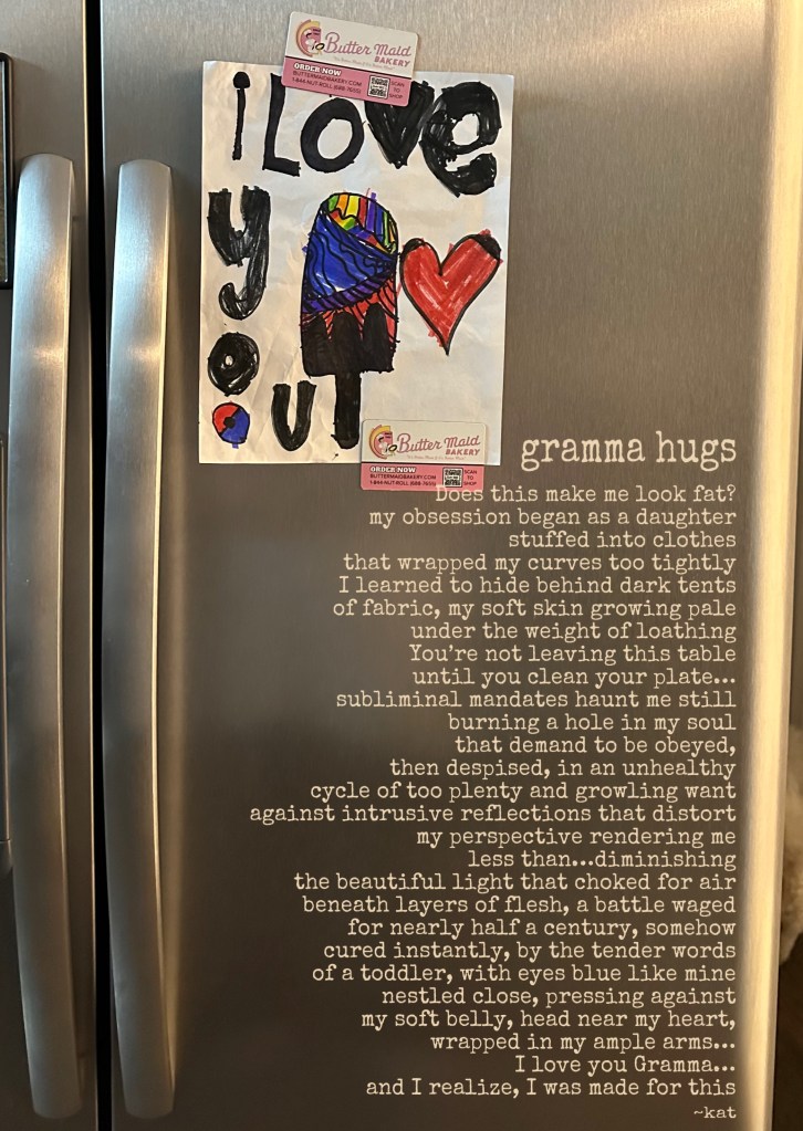 I was a chubby kid. The yo-yo battle between thin and fat started in my teens. Weight has been a relentless foe for most of my life. Those rare seasons when I was able to shed weight happened only because I stopped eating…well mostly. I subsisted on hard boiled eggs, water and lettuce…and a few strawberries to treat myself, which of course is not particularly healthy or sustainable. I am older and supposedly wiser these days but that doesn’t mean I defeated those demons that haunt me still. But I am working toward being healthy. And today’s recounts a true story…the words of a toddler that saved me. Excessive dieting is not the answer to improving my health. That “I love you” murmured from the mouth of a mere babe set me on a path of embracing my curves because, you do understand, don’t you…grandmas that are soft and squishy around the middle give the best pillowy hugs…💕