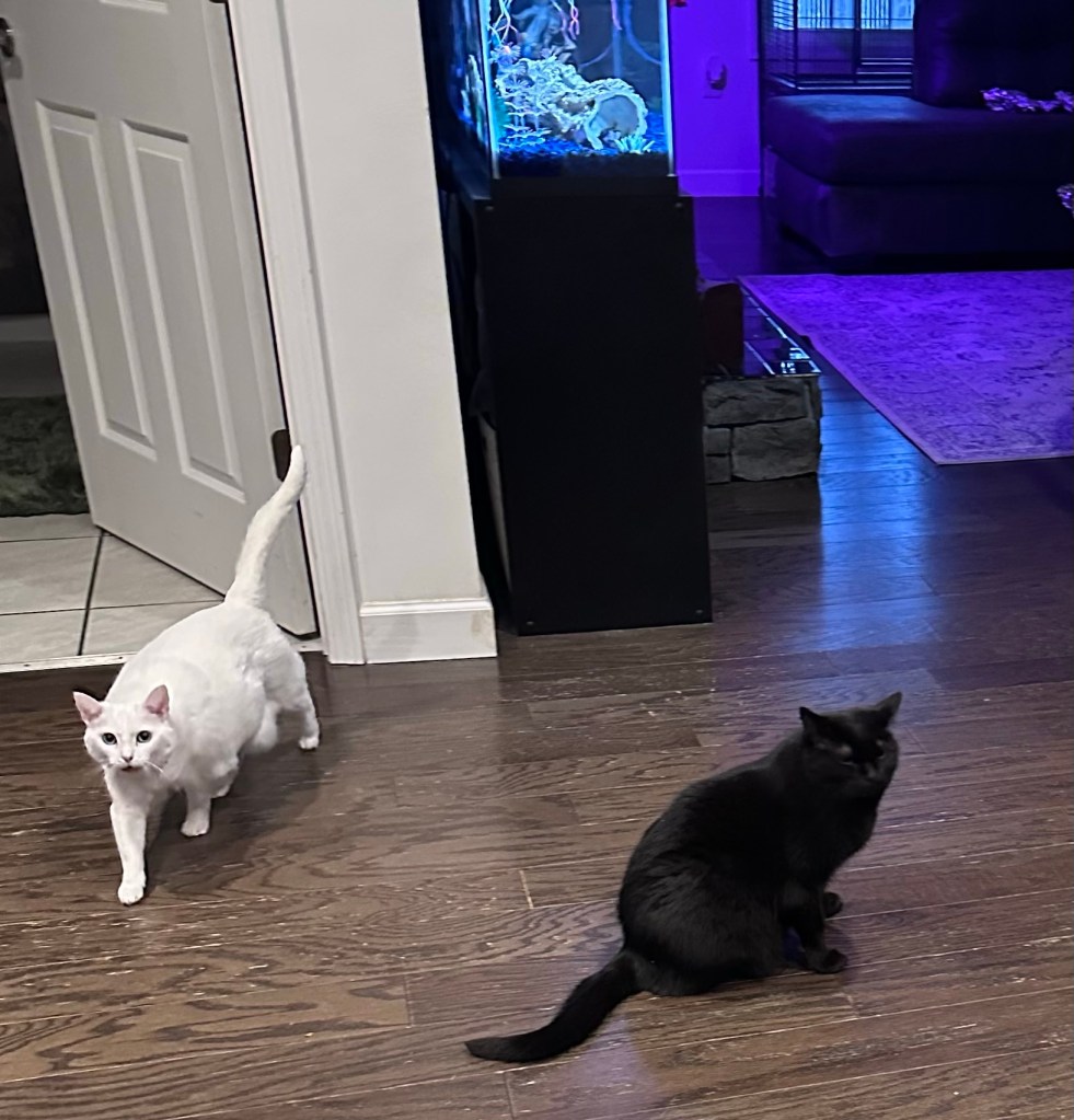 The mom, Matilda, and two of her kittens, Frankie and Schrodinger (two other kittens were adopted by a co-worker…thank goodness!) are living the pampered life of a house cat!