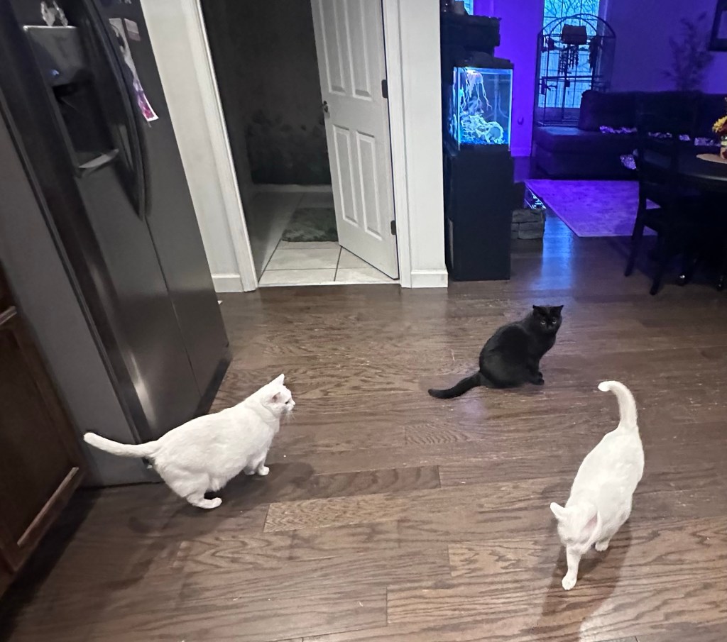 Today while preparing breakfast for my furry, feathered menagerie, my three cats, as they do every morning, gathered to encourage me to get on with it.