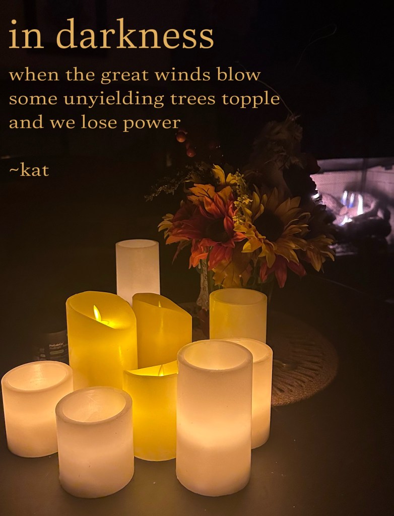 Which brings me to the photo above. True story. The winds came. Big, blustery, mean, cold winds, and as fate would have it, it took a few trees down over some distant power lines that shut my lights out for 22 hours. I was ready this time. I fired up the remote gas logs we picked up recently, especially for an occasion such as this. Hooked up a few small generators…one for the fish tank, one for T’s c-pap machine. Tucked us all in and slept soundly under our sturdy metal roof under the stars. Even in the dark there are glimmers. The fire’s warmth and glow, flickering candlelight, and the sweet silence that happens when my houseful of buzzing, ticking, grinding appliances goes silent. It’s good sleeping in the quiet of a dark night in the woods.