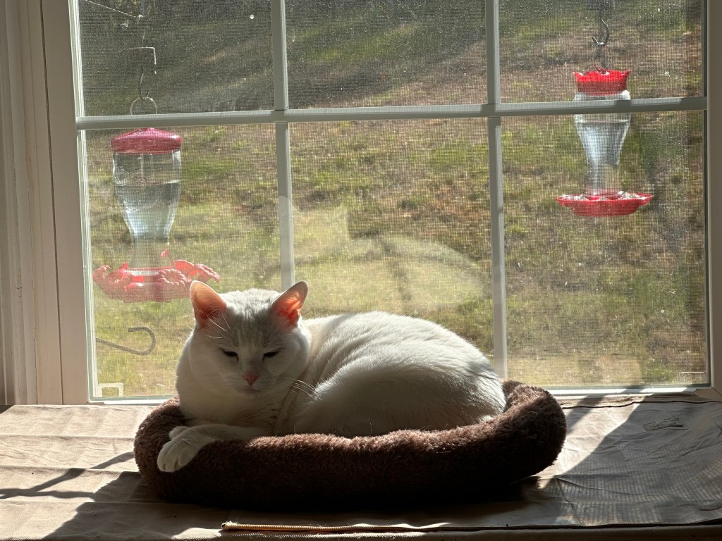 Today’s Glimmer….is more like a flash, a flicker and a twitter. The hummingbirds are back! And Frankie is commandeering the best seat in the house! The other two…well you can clearly see their attitude.