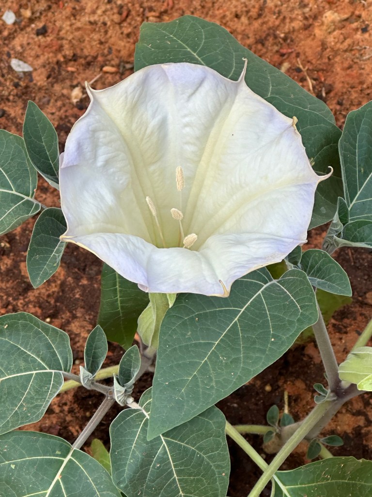 Today’s glimmer is a real beauty. First full bloom of our moon flower. While it can be highly toxic to people, but the bees, butterflies, and hummingbirds, seem to love it, especially when it blooms at night. I was able to catch a photo in the morning! Fascinating plant.