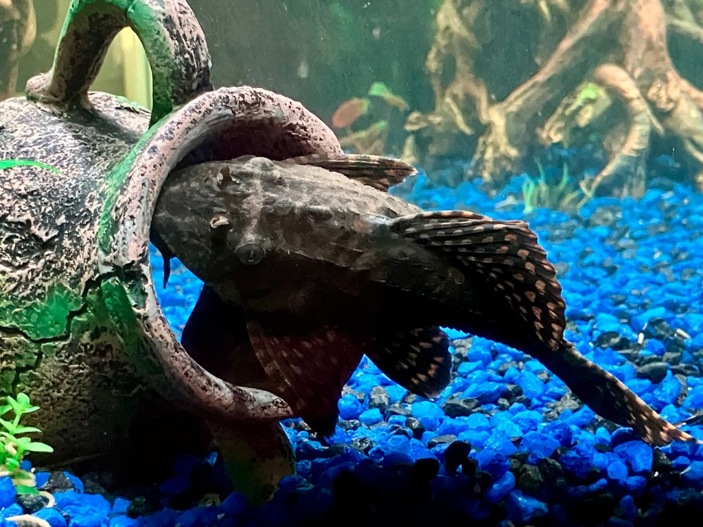 I’m calling today’s glimmer “mission accomplished!” There is a certain satisfaction in accomplishing a task without any leftover parts! Our resident plecostomus has outgrown our meager 30 gallon fish tank…perfectly fine for tetras and snails, but totally inadequate for a monster, prehistoric looking ground feeder. We decided to gift our wine cabinet buffet hutch to a young couple we know…we don’t even drink wine!!! What were we thinking when we thought we needed that piece of furniture in our dining room…pass a shot of good bourbon on the rocks if you please! 😉 I ordered a rush tank cabinet and it arrived this week. Managed to dolly it up to the back porch and set to the task of piecing it together…let’s just say I am an expert with an allen wrench, the go-to tool for all furniture kits from China! A short three hours later, I had completed the project! It is beautiful, sturdy, and will make a nice addition to our dining area…and I can’t wait to introduce our pleco to his new digs! There are sure to be more photos to come!!!