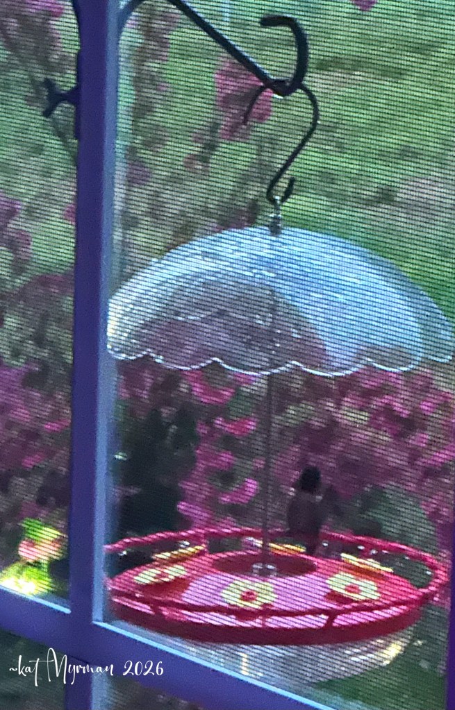 It’s been raining for two days. I am awash in vibrant deep green and slate gray skies…glimmers are even more needed now to fend off my tendency for SAD. Not even a sunset to bright my spirits this evening… 😢 I was beginning to think I might need to hunt through old photographs to find a glimmer…and then I saw a tiny dark shadow flutter outside my window. There on the new feeder I had purchased this year with a clear acrylic umbrella was a young hummingbird facing away from the sugar wells, taking in the rain, safe and under cover! It made me so happy! Proving to me once again that I don’t need to find glimmers…I just need to notice them. ✨✨✨💚💚💚✨✨✨