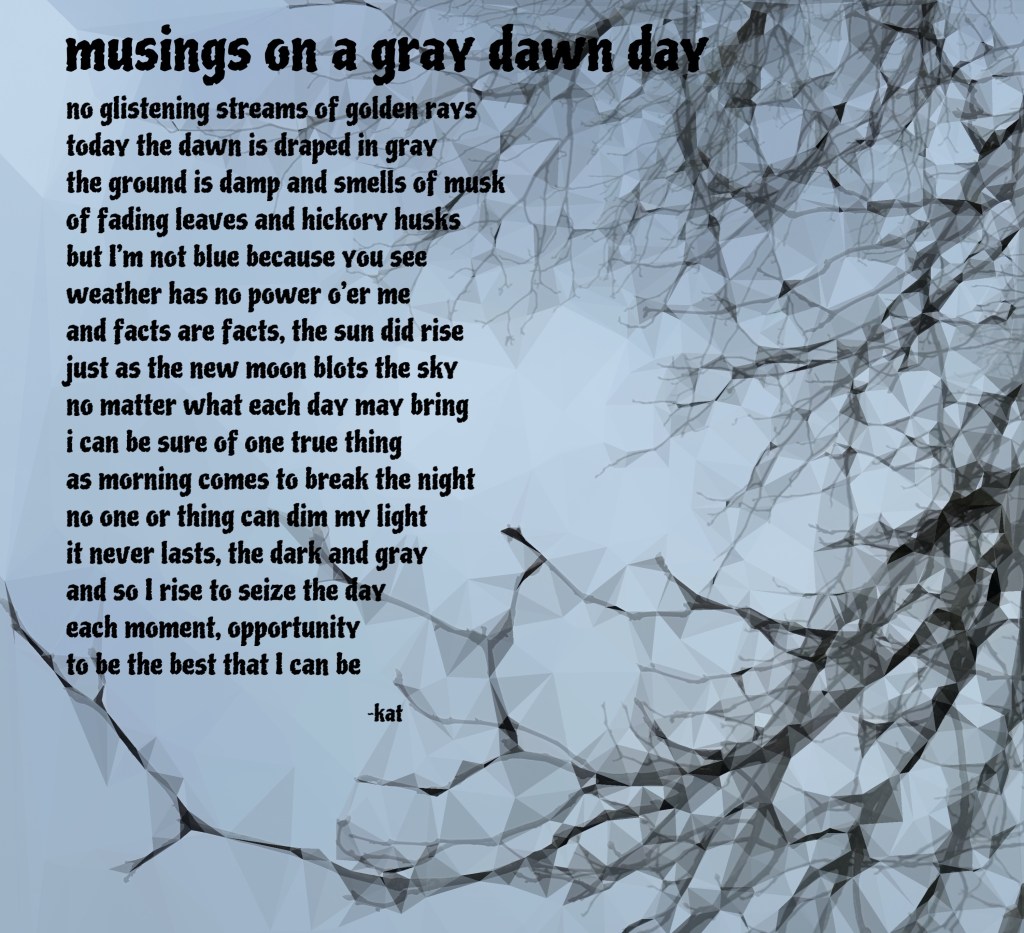 no glistening streams of golden rays today the dawn is draped in gray the ground is damp and smells of musk of fading leaves and hickory husks but I’m not blue because you see weather has no power o’er me and facts are facts, the sun did rise just as the new moon blots the sky no matter what each day may bring i can be sure of one true thing as morning comes to break the night no one or thing can dim my light it never lasts, the dark and gray and so I rise to seize the day each moment, opportunity to be the best that I can be
