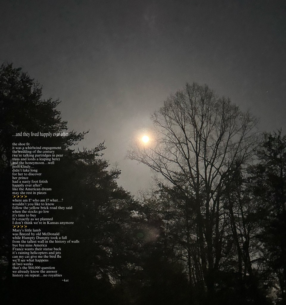 the shoe fit it was a whirlwind engagement the wedding of the century (we’re talking partridges in pear trees and lords a leaping here) and the honeymoon…well poor Cindy… didn’t take long for her to discover her prince had a nasty foot fetish happily ever after? like the American dream may she rest in pieces ✨✨✨✨ where am I? who am I? what…? wouldn’t you like to know follow the yellow brick road they said when the stocks go low it’s time to buy It’s exactly as we planned I don’t think we’re in Kansas anymore ✨✨✨✨ Mary’s little lamb was fleeced by old McDonald while Humpty Dumpty took a fall from the tallest wall in the history of walls bye bye miss America France wants their statue back it’s raining helicopters and jets can my cat give me the bird flu we’ll see what happens in two weeks that’s the $64,000 question we already know the answer history on repeat…no royalties