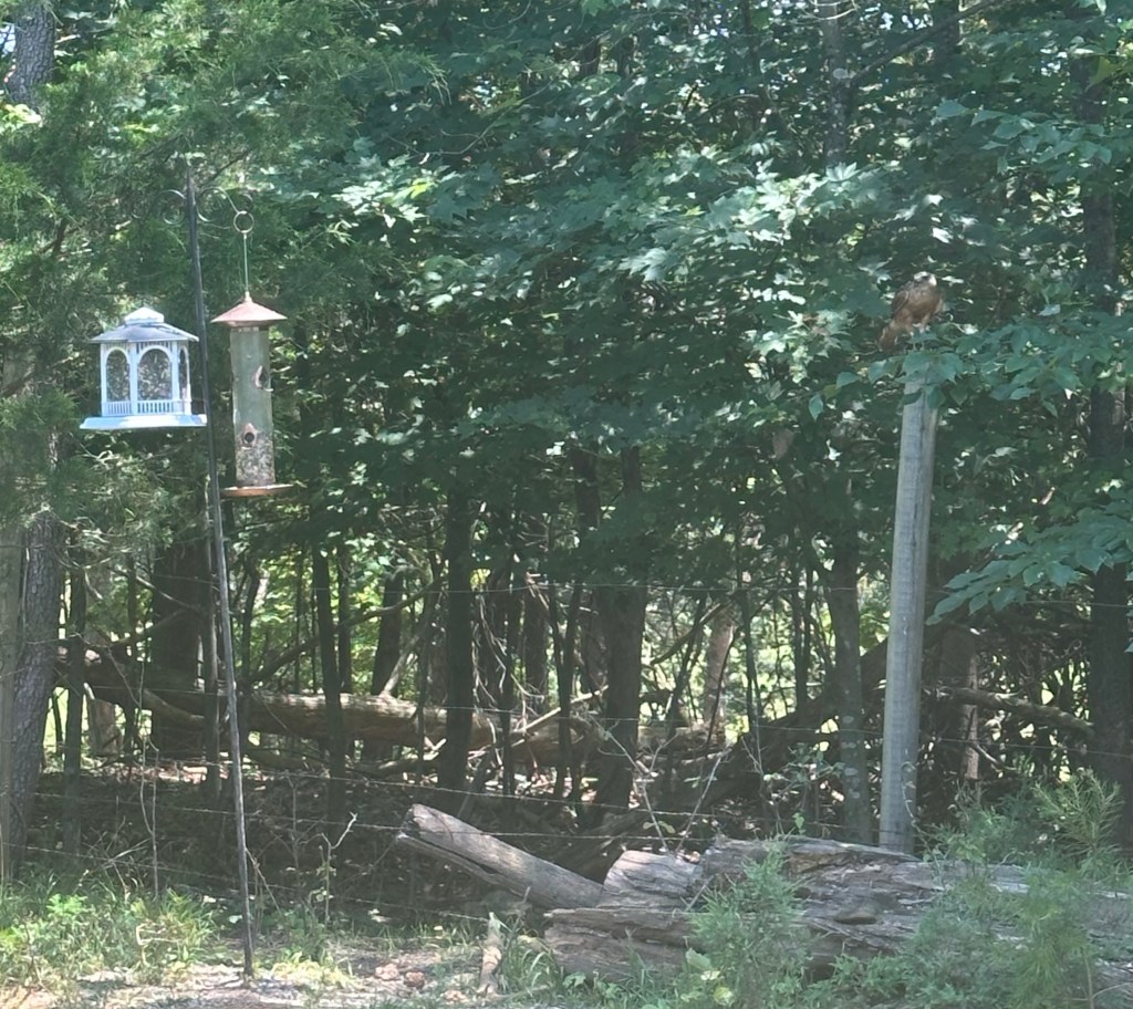 And that’s when I saw him, a magnificent red shouldered hawk perched a few yards away from the bird feeders. It was clear that the finches, cardinals, wrens, tits, cowbirds, and mourning doves had sent out the alarm…best to take shelter…danger from above. (Ironic, isn’t it, that humans in various locations are exercising a similar practice these very days…but for much more selfish, malevolent reasons…power, greed, and hate…but I digress…)