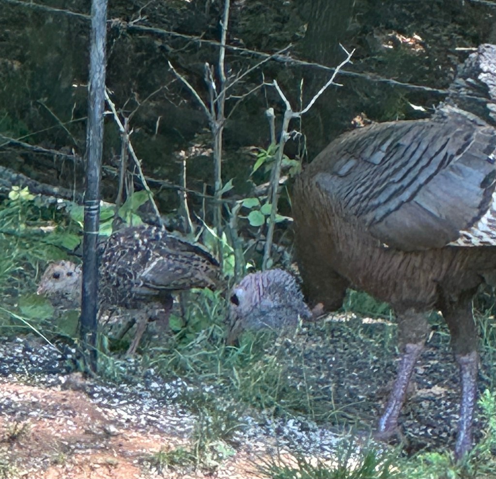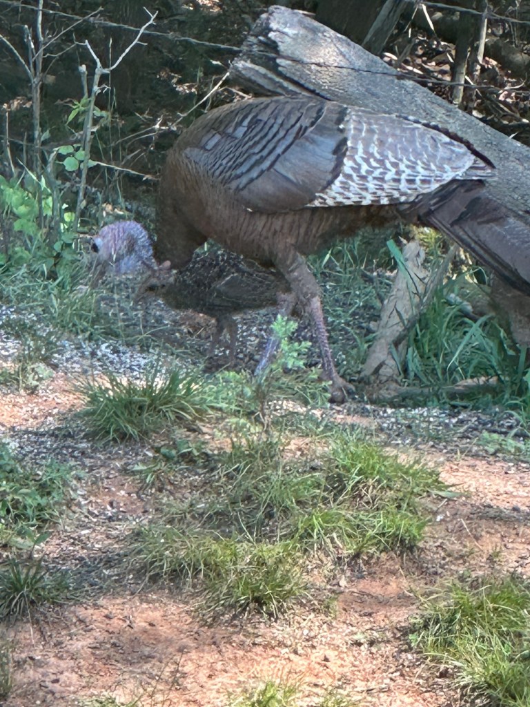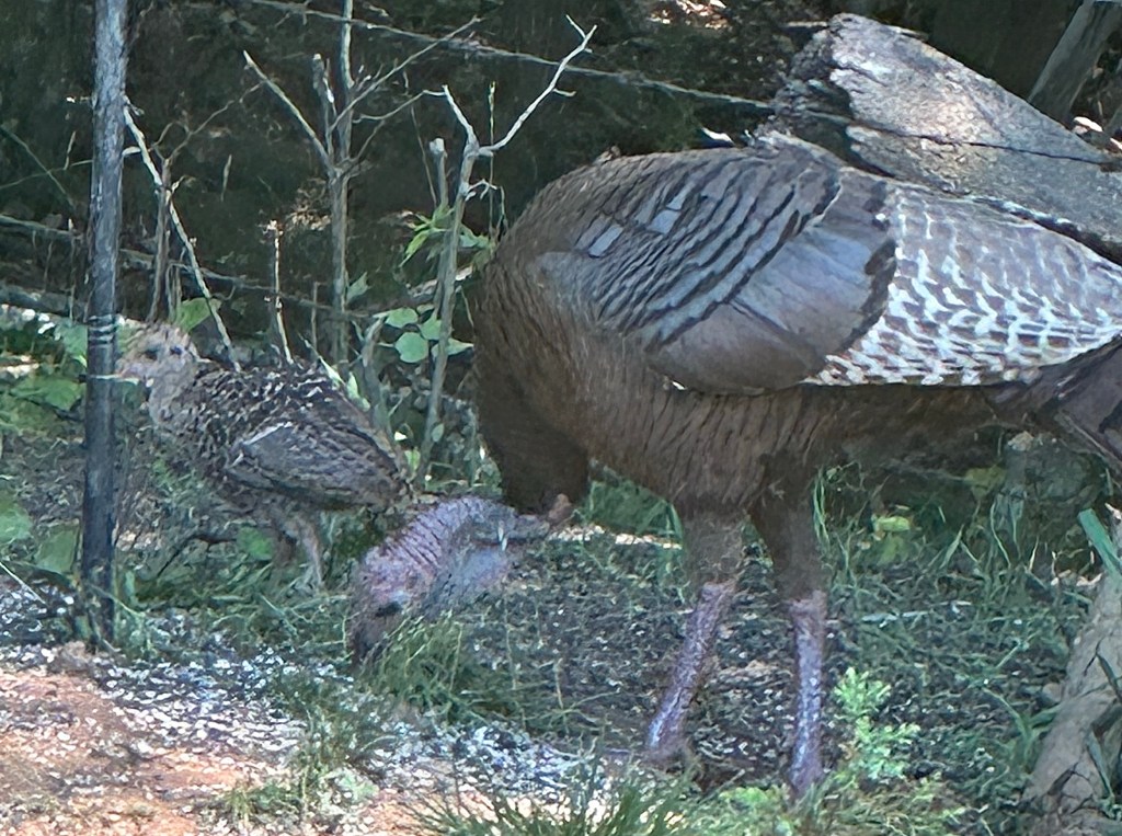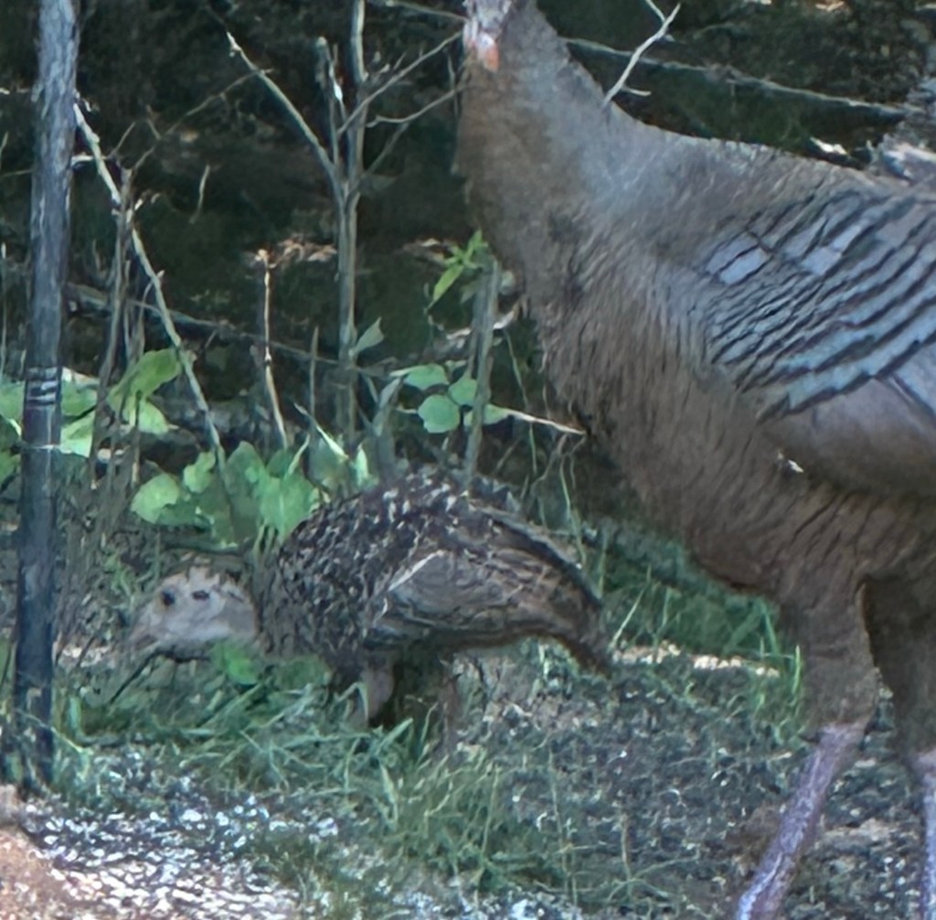 a turkey hen showing her chick where the feeders are at dawn……after breakfast they head to the dust pit for a spa treatment.,,