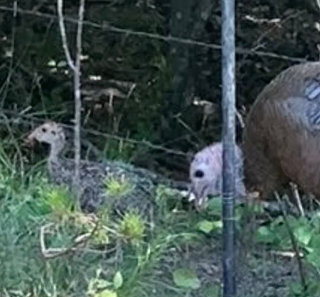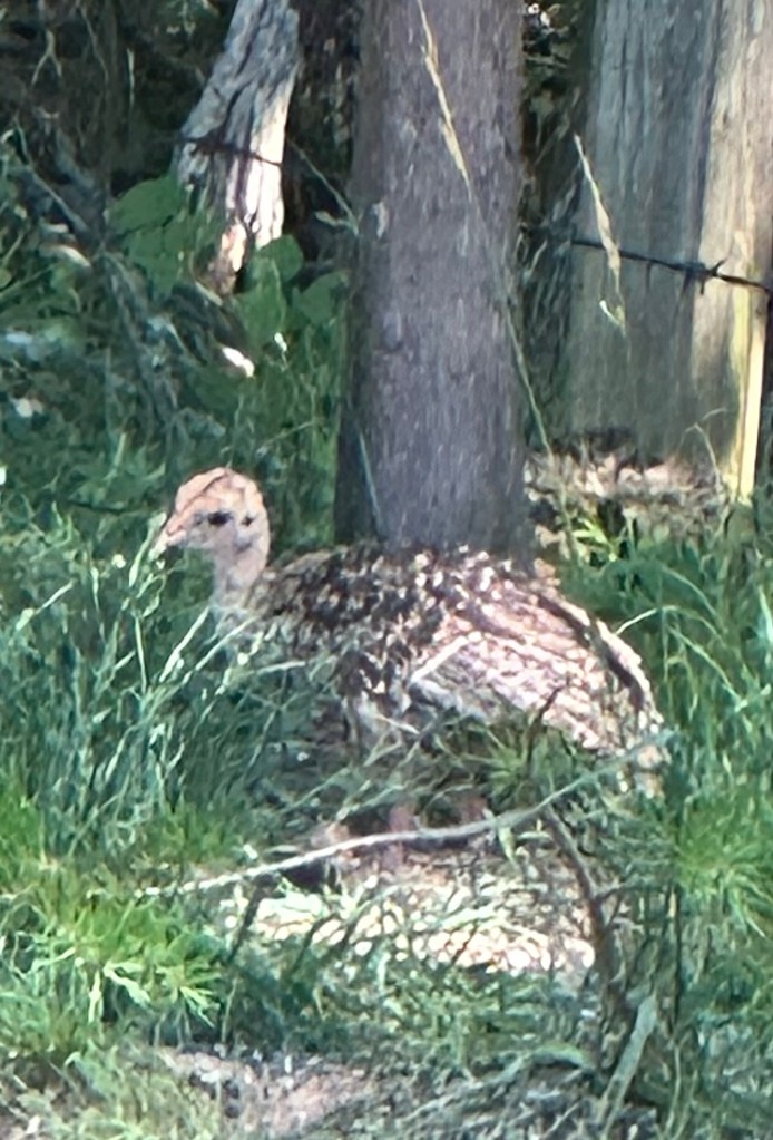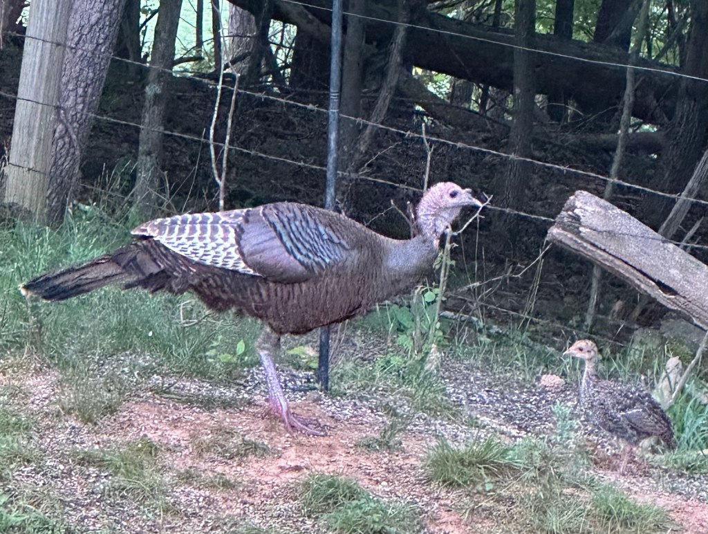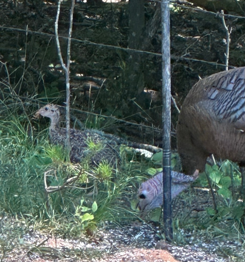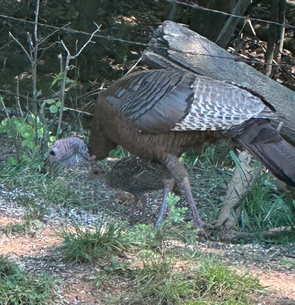 a turkey hen showing her chick where the feeders are at dawn……after breakfast they head to the dust pit for a spa treatment.,,