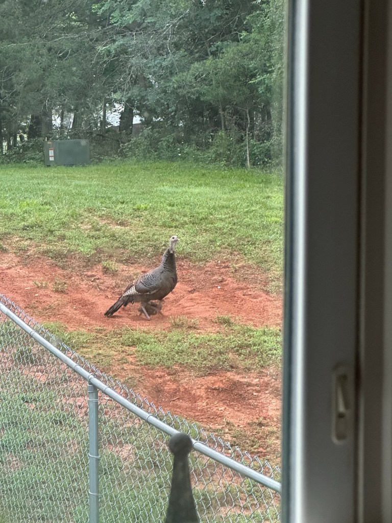 Our landscaper asked us if we wanted him to fill in that exposed area of red clay and dust on the hill in our back yard area. And then he backtracked and said…never mind…I know you guys. It’s true. How could we sod over an area that gives the local turkeys (and us as their witnesses) so much happiness! I felt so fortunate to catch this dust bath ritual on film!