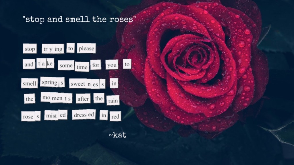 stop trying to please and take some time for you to smell spring’s sweetness in the moments after the rain roses misted, dressed in red