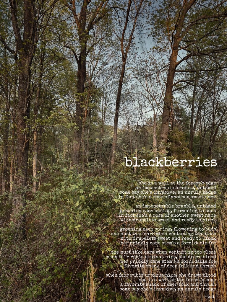 greening each spring, flowering to buds one must take care when venturing too close with drupelets sweet and ready to pluck her prickly cane stem’s a formidable foe