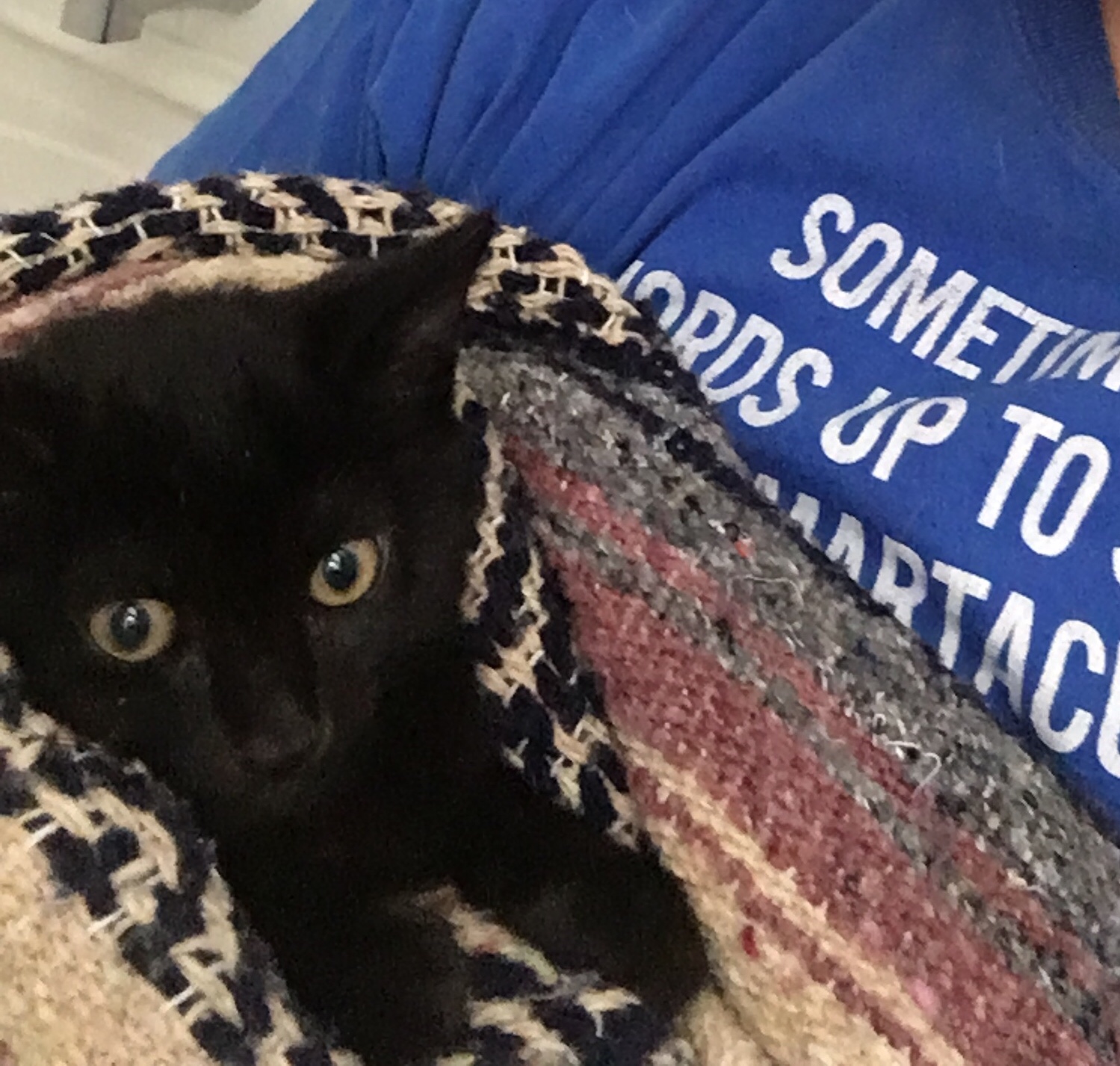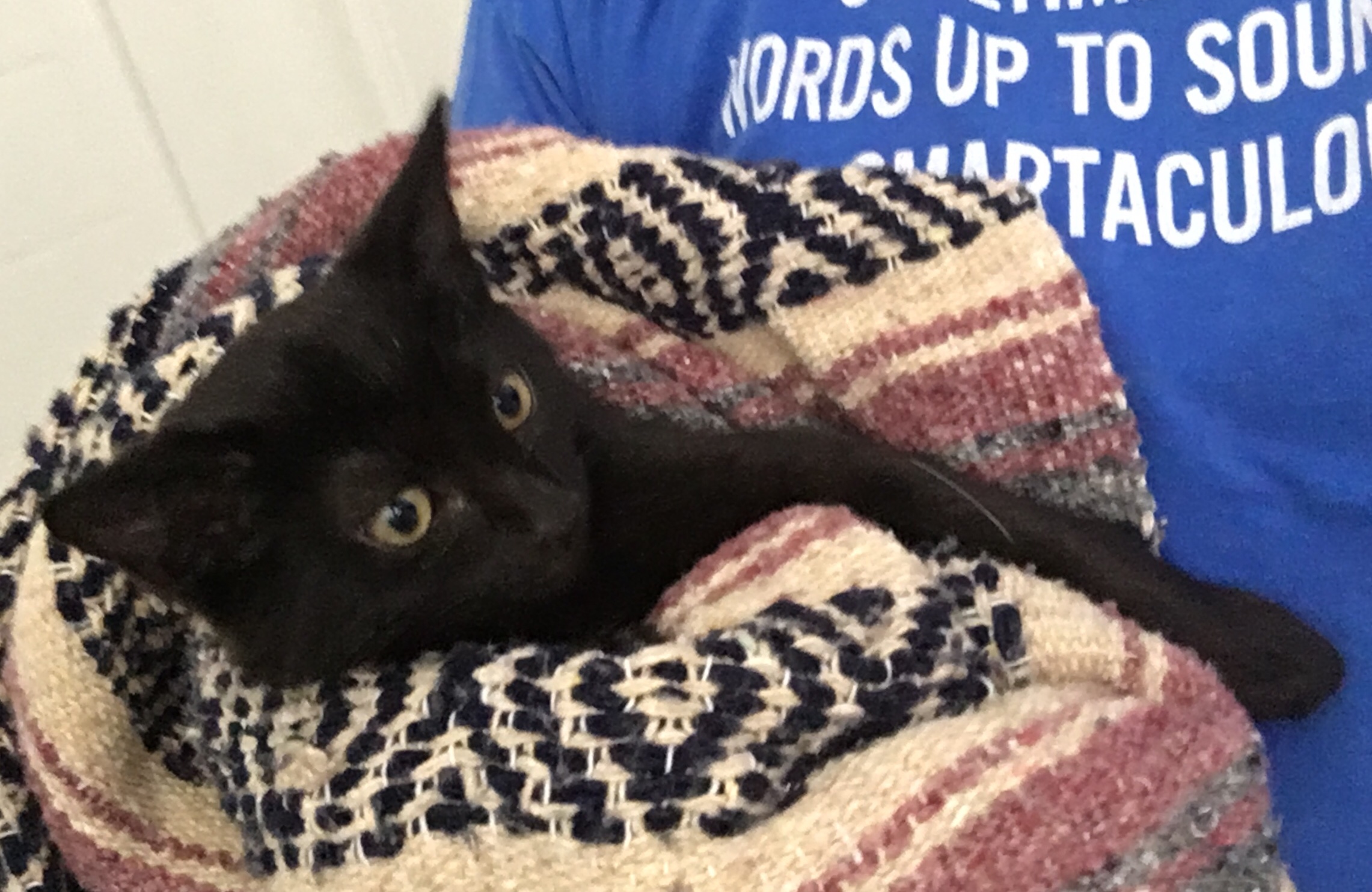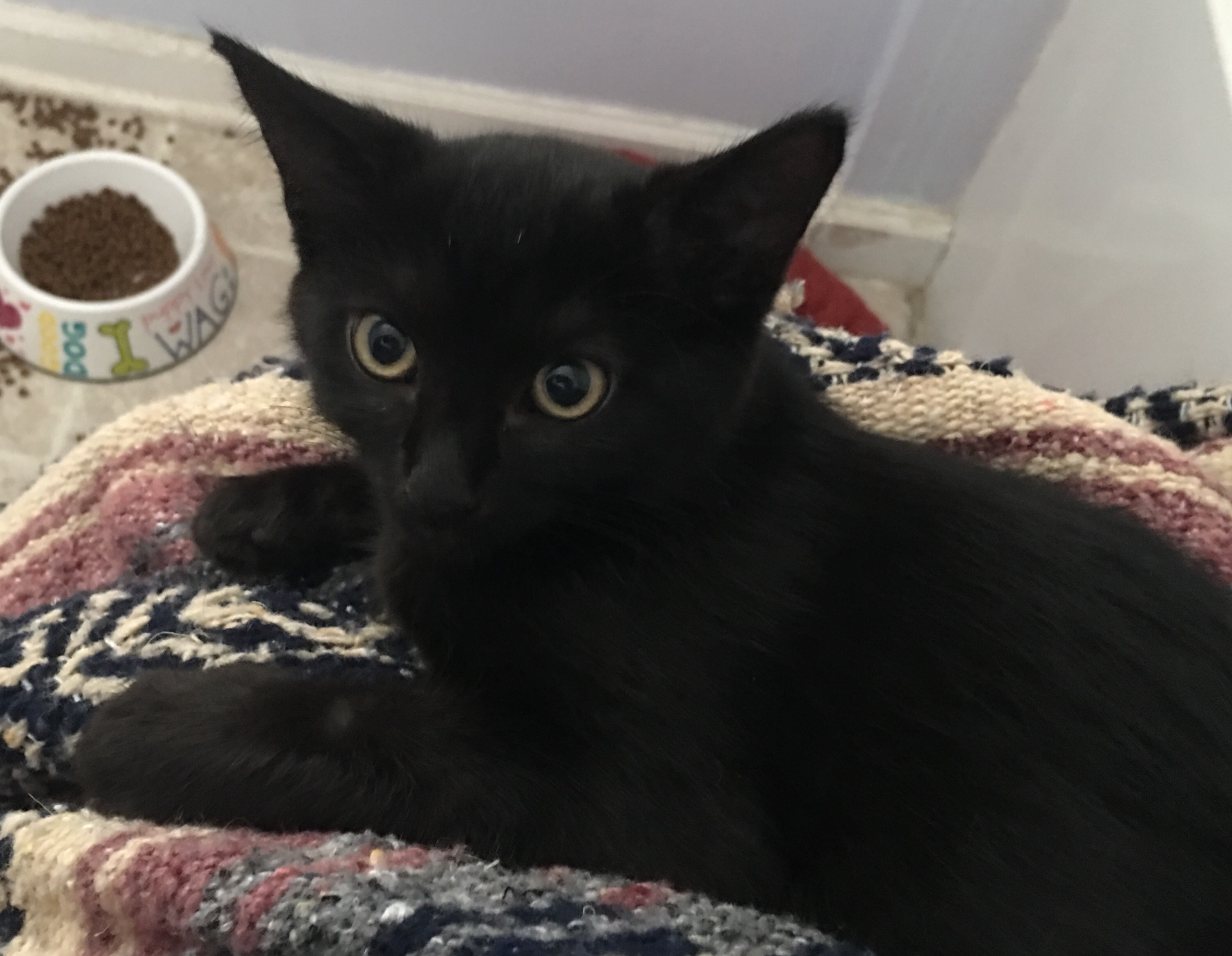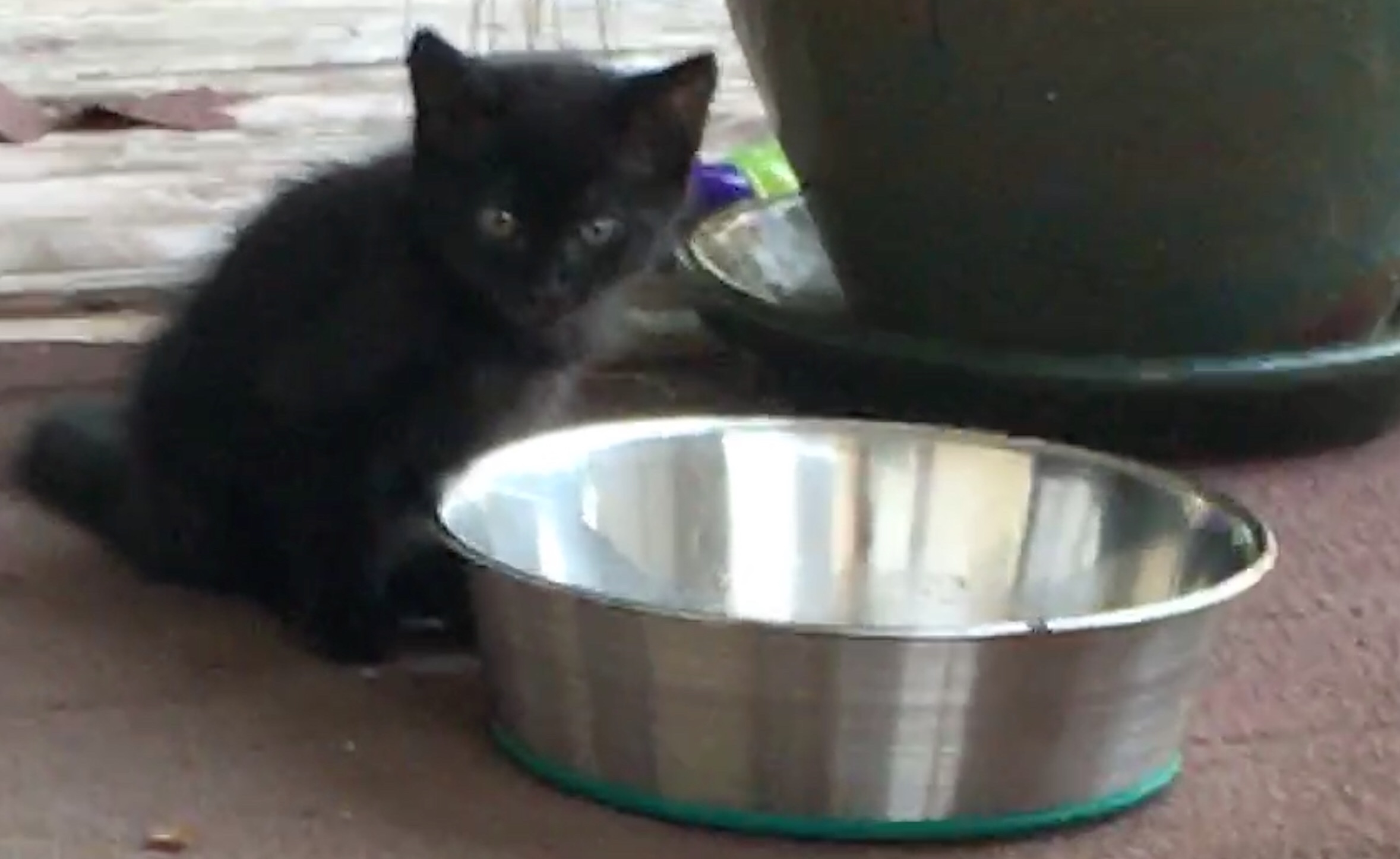 I have been feeding the fugitives every morning and night seeking to gain their trust. The mama cat has warmed to me letting me pet her briefly as I put the food bowl down, but the kitten has been a formidable escape artist. I had set up an animal crate with a long boa feather lure on the porch (everyone thought I was crazy). As I returned from my morning walk on Wednesday, the kitten took the bait and I was able to capture it!