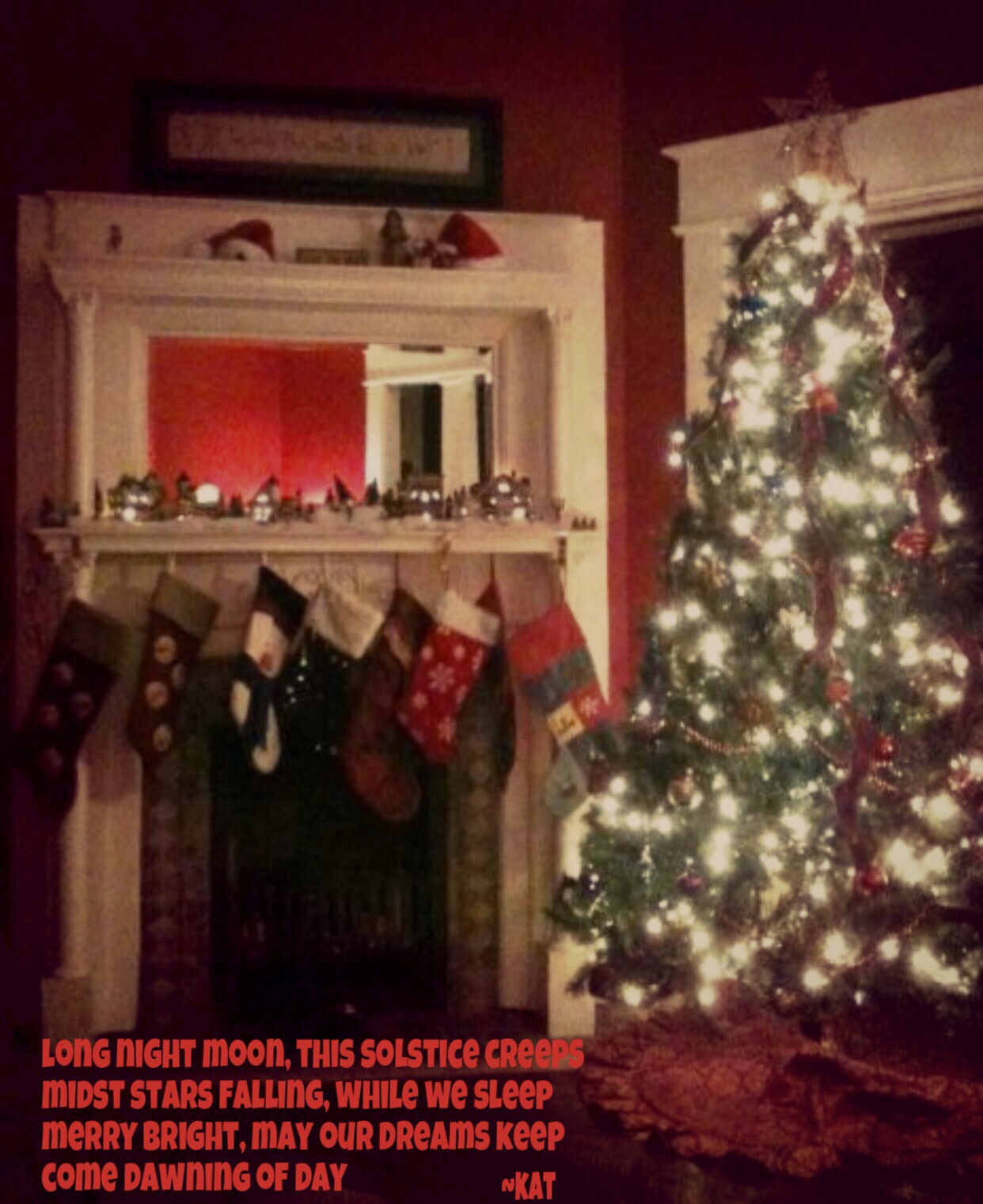 Awesome tales everyone! And a Merry Christmas to you (if you celebrate). Thanks to everyone who participated last week. For this week’s photo prompt, one of my own creations. I happened upon a decorated tree on my walk with the pup the other night. Not the kind of tree you expect of course. But I found it really beautiful in its simplicity. There is also a red light in the attic of the house just past the tree. Not sure what that’s about. I suppose red is a Christmas color. That is the only decoration. To each their own. I managed to hang a wreath on the front door. Jingle jingle all the way. 🙂 Have a great week. See you at next week’s roundup.