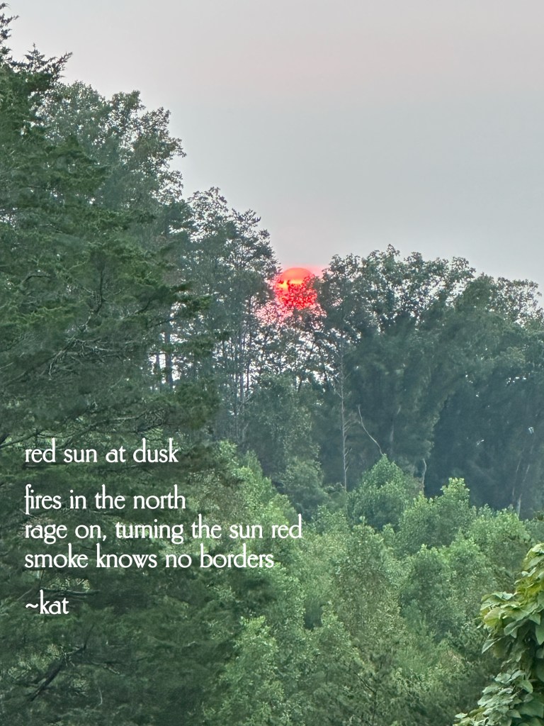 This time of year the western sky is often blush red and amber as the sun sets. But today the sun itself was crimson red. From the news I learned that this phenomenon is caused by smoke in the atmosphere from the wildfires in Canada. It was an odd sight. A glimmer if you will that reminded me that the earth does not concern herself with boundaries or walls or borders. We are all citizens of the world.
