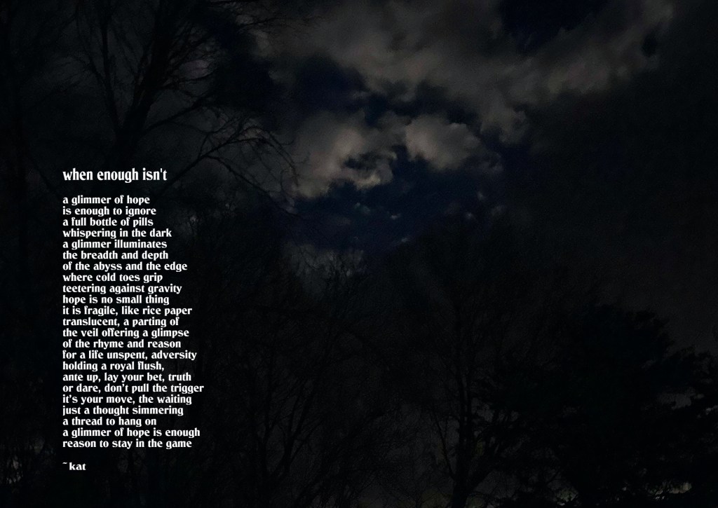 a glimmer of hope is enough to ignore a full bottle of pills whispering in the dark a glimmer illuminates the breadth and depth of the abyss and the edge where cold toes grip teetering against gravity hope is no small thing it is fragile, like rice paper translucent, a parting of the veil offering a glimpse of the rhyme and reason for a life unspent, adversity holding a royal flush, ante up, lay your bet, truth or dare, don’t pull the trigger it’s your move, the waiting just a thought simmering a thread to hang on a glimmer of hope is enough reason to stay in the game