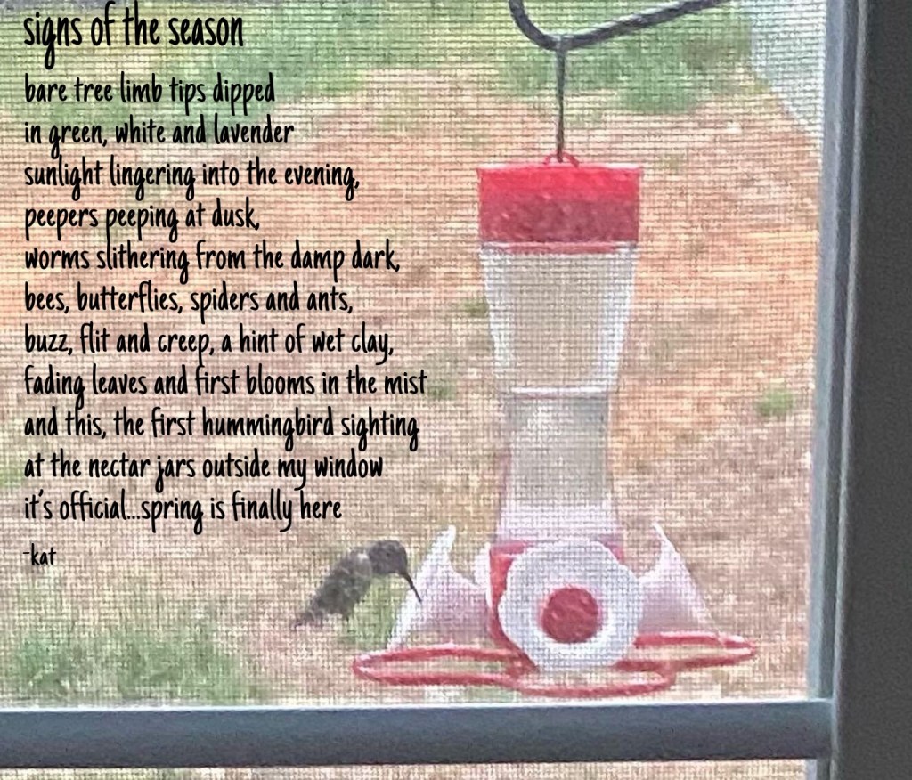 bare tree limb tips dipped in green, white and lavender sunlight lingering into the evening, peepers peeping at dusk, worms slithering from the damp dark, bees, butterflies, spiders and ants, buzz, flit and creep, a hint of wet clay, fading leaves and first blooms in the mist and this, the first hummingbird sighting at the nectar jars outside my window it’s official...spring is finally here