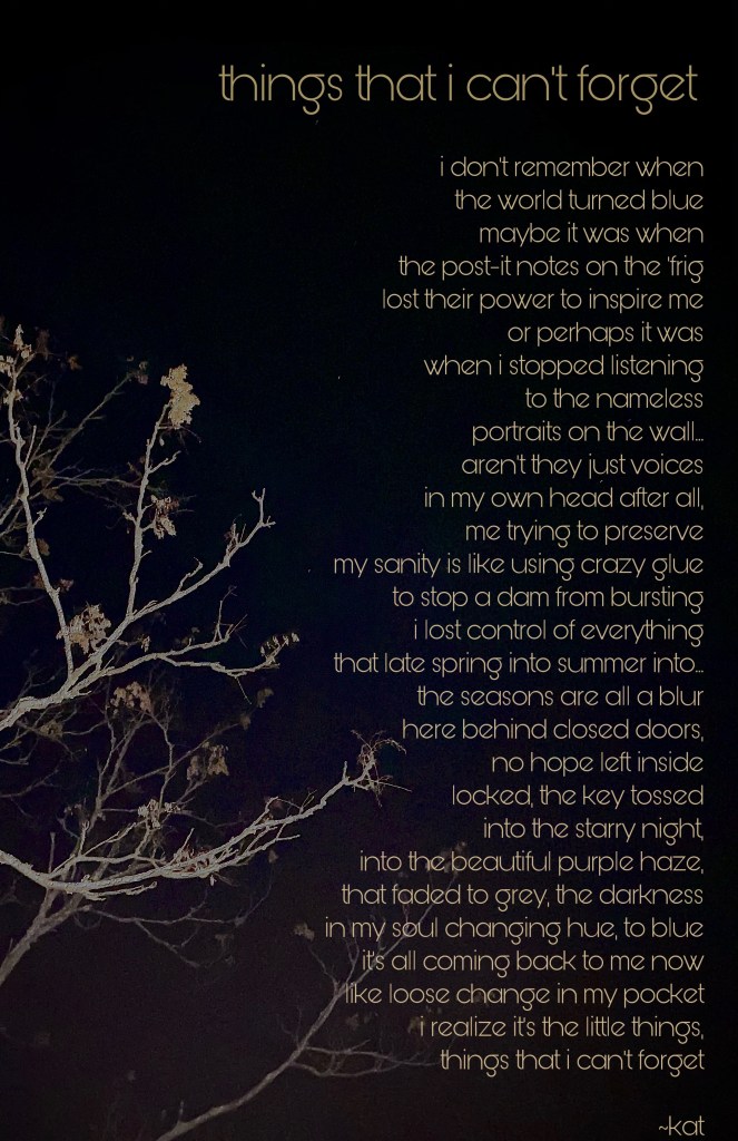 i don’t remember when the world turned blue maybe it was when the post-it notes on the ‘frig lost their power to inspire me or perhaps it was when i stopped listening to the nameless portraits on the wall... aren’t they just voices in my own head after all, me trying to preserve my sanity is like using crazy glue to stop a dam from bursting i lost control of everything that late spring into summer into... the seasons are all a blur here behind closed doors, no hope left inside locked, the key tossed into the starry night, into the beautiful purple haze, that faded to grey, the darkness in my soul changing hue, to blue it’s all coming back to me now like loose change in my pocket i realize it’s the little things, things that i can’t forget