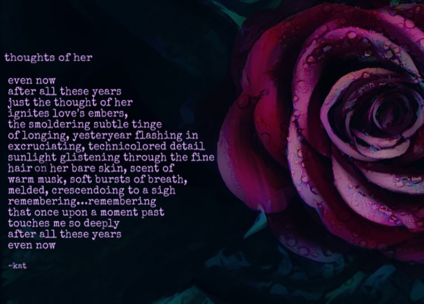 even now after all these years just the thought of her ignites love’s embers, the smoldering subtle tinge of longing, yesteryear flashing in excruciating, technicolored detail sunlight glistening through the fine hair on her bare skin, scent of warm musk, soft bursts of breath, melded, crescendoing to a sigh remembering…remembering that once upon a moment past touches me so deeply after all these years even now