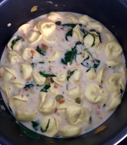 I’ve been wanting to do a tortellini soup for a while. The recipe below is my own creation, based on reading several versions. If you like chorizo sausage, you can add a pound of chopped chorizo to the initial sauté. Being an ovo-lacto-pescatarian (I eat eggs, milk and fish with my veggies), I like to keep my soups meatless.