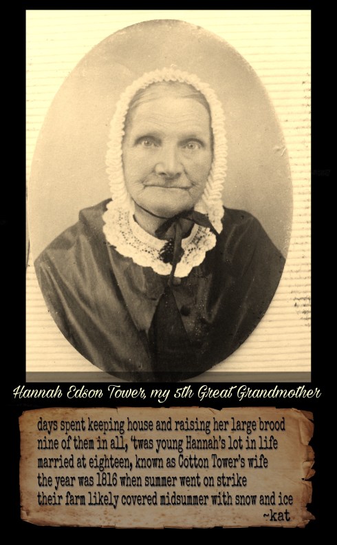 History recounts the year 1816 as “The Year Of No Summer”. It was also the year my 5th Great Grandparents, Hannah Edson and Cotton Tower married. Cotton was a Farmer by trade. Hannah, who I am fortunate to have a photograph of, is listed on census records as a housewife. With 9 children I can’t imagine she had much time for anything else besides birthing and tending to her children. They all seem to have been of hearty stock though. Hannah died at the ripe old age of 74, with Cotton following her nearly a decade later at 85. They lived in Leavenworth, Indiana. I imagine the farms in that part of the country felt the chill, along with the rest of the world, caused by the eruption of Mount Tambora in Indonesia. It is said that the atmosphere was thick with volcanic ash, limiting the amount of sunlight, cooling the Earth’s surface, and causing a once-in-a-lifetime event: a year-long winter.