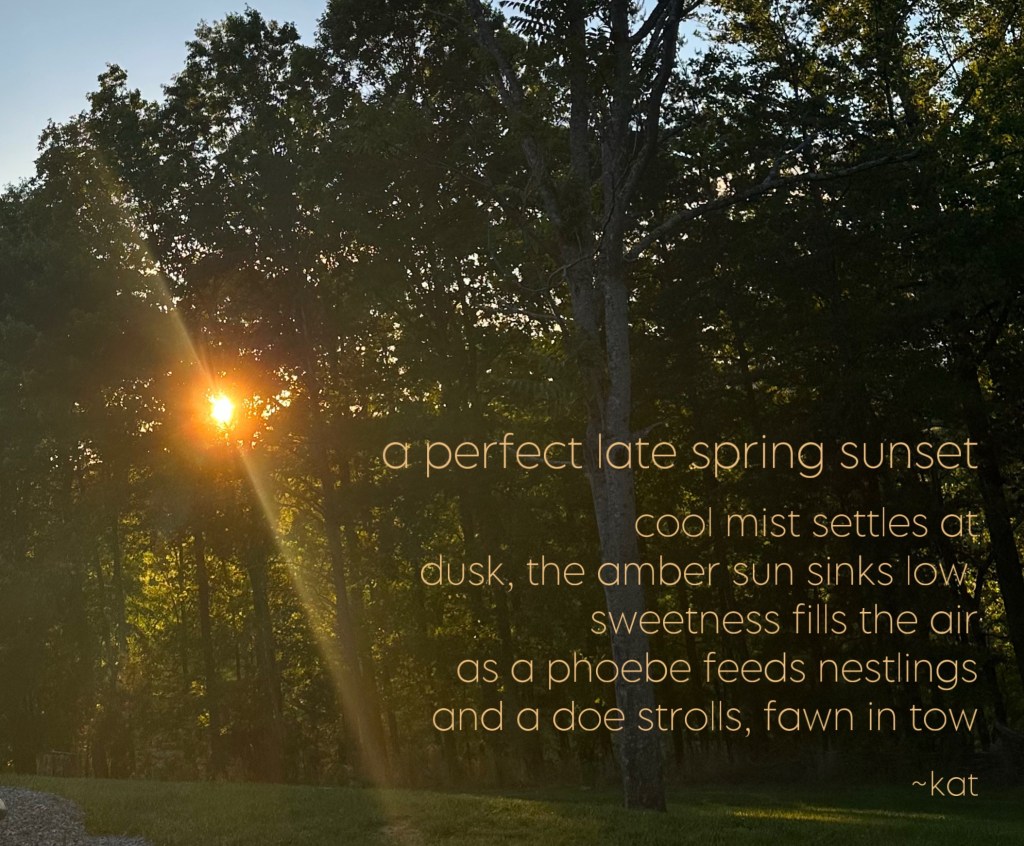 cool mist settles at dusk, the amber sun sinks low, sweetness fills the air as a phoebe feeds nestlings and a doe strolls, fawn in tow