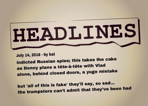Final installment of this week’s Terza Rima featuring “Headlines”. It reads a bit like a nightmare all told, as you can see by the finished version in total below. What we recently learned (today’s headline) is that the Russian government did indeed hack democratic email and electoral servers, and very likely has also had a hand in other democratic processes around the globe including the Brexit outcome. All part of a grand plan to disrupt democracy and drive a wedge between allies who have long fought side by side against tyranny with trump complicit in the scheme. A one-on-one “summit” is still going forward on Monday, trump says; no witnesses, no notetakers. We will never know the truth about what happens there, but it’s a good guess that Putin will be tightening the strings on his favorite puppet, congratulating him for a job well done at NATO and in the U.K. this past week, while also strongly suggesting that trump and his minions put an end, once and for all, to the investigation in the U.S. Like I said, it’s a nightmare. I wish it really was a nightmare, in fact, one that we could wake up from, realizing that none of this is true. ☹️