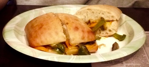 In a large skillet or wok toss the vegetable strips, salt, garlic and hot sauce in olive oil until they are tender. Meanwhile, slice the ciabatta rolls and place each half open-faced on a baking sheet. Top each with a slice of muenster cheese and bake in a 350 degree oven until the cheese is melted. Assemble each sandwich while the cheese bread is still hot (right out of the oven).