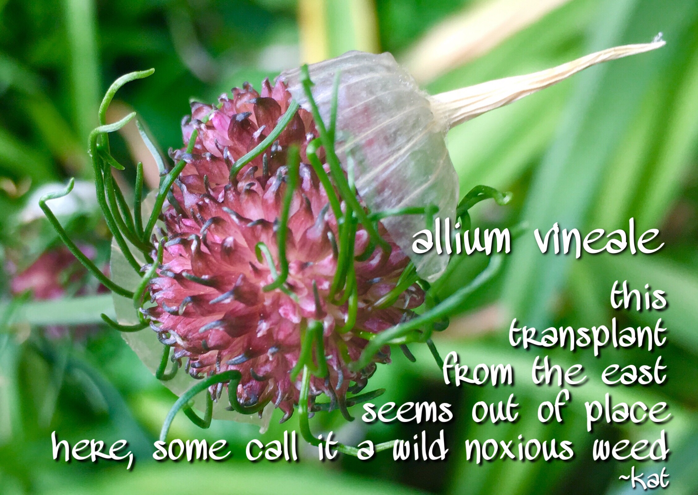 From Wikipedia: Allium vineale (wild garlic, onion grass, crow garlic or stag’s garlic…also called “Dready”) is a perennial, bulb-forming species of wild onion, native to Europe, northwestern Africa and the Middle East. The species was introduced in Australia and North America, where it has become a noxious weed.